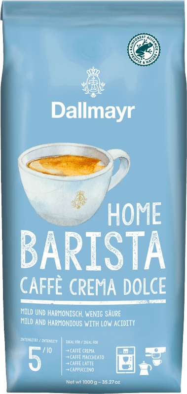 Dallmayr ganz Kaffeebohnen in der Home Barista Serie für den Baristagenuss zuhause. Die Kaffeebohnen Caffe Crema Dolce sind für Kaffeemühlen, Kaffeevollautomaten, Espressomaschinen und gemahlen für Siebträgermaschinen bestens geeignet.