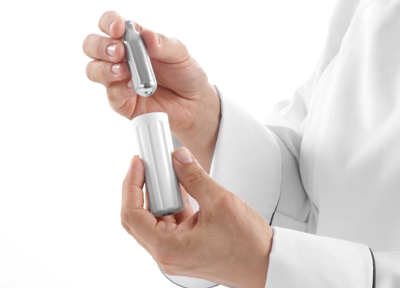 Der Sahnespender für ihre Küche zur Herstellung leckerer Sprühsahne frisch aus dem Sahnespender. Der Sahnespender ist aus einer weiß beschichteten Aluminiumflasche und hat einen Aluminiumkopf. Mit den 3 verschiedenen Spritztüllen können sie individuell ihre Desserts, Mousse und Gebäck verfeinern. Den Sahnespender können sie einfach und praktisch im Kühlschrank lagern. Zur einfachen Reinigung ist im Lieferumfang eine Reinigungsbürste enthalten. Der Sahnespender ist nicht spülmaschinengeeignet, nicht für die Mikrowelle und Bain-Marie. Hendi Nummer: 588369. Für den Sahnespender sollten ausschließlich Sahnekapslen (N2O) verwendet werden. Maße: (øxH) 8×26 cm.