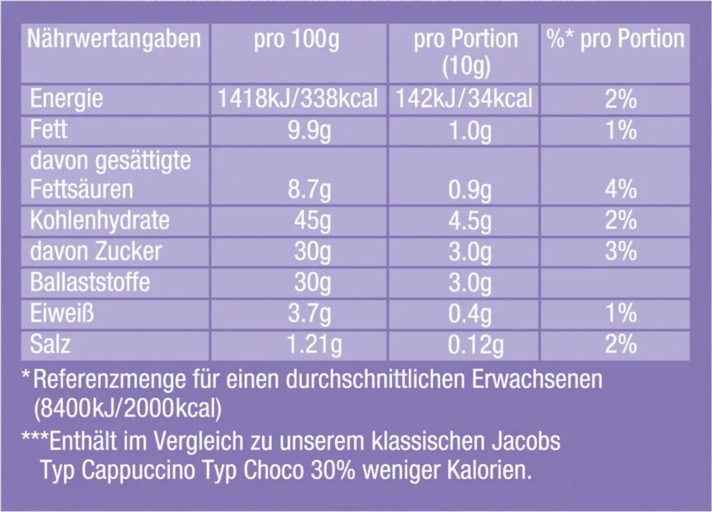 JACOBS Choco so leicht Cappuccino hat 30% weniger Kalorien als ein herkömmlicher Choco Cappuccino bei genauso lecker-schokoladigem Geschmack. Die neue innovative Trendvariante JACOBS Choco so leicht Cappuccino spricht Konsumenten an, die auf eine leichte und kalorienbewusste Ernährung achten, aber nicht auf den Genuss eines leckeren Choco Cappuccinos verzichten möchten. JACOBS Choco so leicht Cappuccino hat 30% weniger Kalorien als ein herkömmlicher Choco Cappuccino bei genauso lecker-schokoladigem Geschmack. Die neue innovative Trendvariante JACOBS Choco so leicht Cappuccino spricht Konsumenten an, die auf eine leichte und kalorienbewusste Ernährung achten, aber nicht auf den Genuss eines leckeren Choco Cappuccinos verzichten möchten.