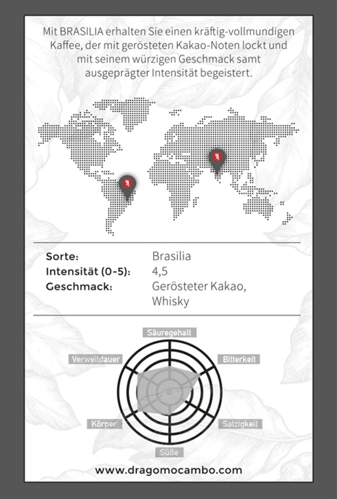 Mit BRASILIA erhalten Sie einen kräftig-vollmundigen Kaffee, der mit gerösteten Kakao-Noten lockt und mit seinem würzigen Geschmack (gerösteter Kakao, Whisky, erdig) samt ausgeprägter Intensität begeistert.
